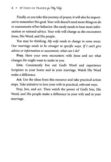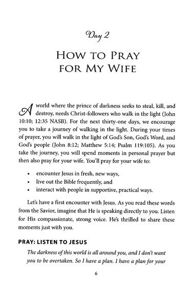 • A powerful, Scripture-based prayer strategy for both you and your wife to better love the Lord, live God’s Word, love people, and live His mission.