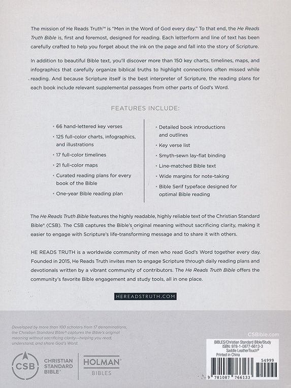 Men of God are Men of His Word The CSB He Reads Truth Bible is a great resource for men seeking to know God’s Word. It includes well-crafted theological memos to increase biblical literacy. Each book of the Bible is color coded by genre and features detailed book introductions, a reading plan, and full-color maps, charts, and timelines. This Bible invites every man to count himself as part of the He Reads Truth community of “Men in the Word of God every day.” Features: 66 hand-lettered key verses 125 full-color charts, infographics, and illustrations 17 full-color timelines 21 full-color maps Curated reading…