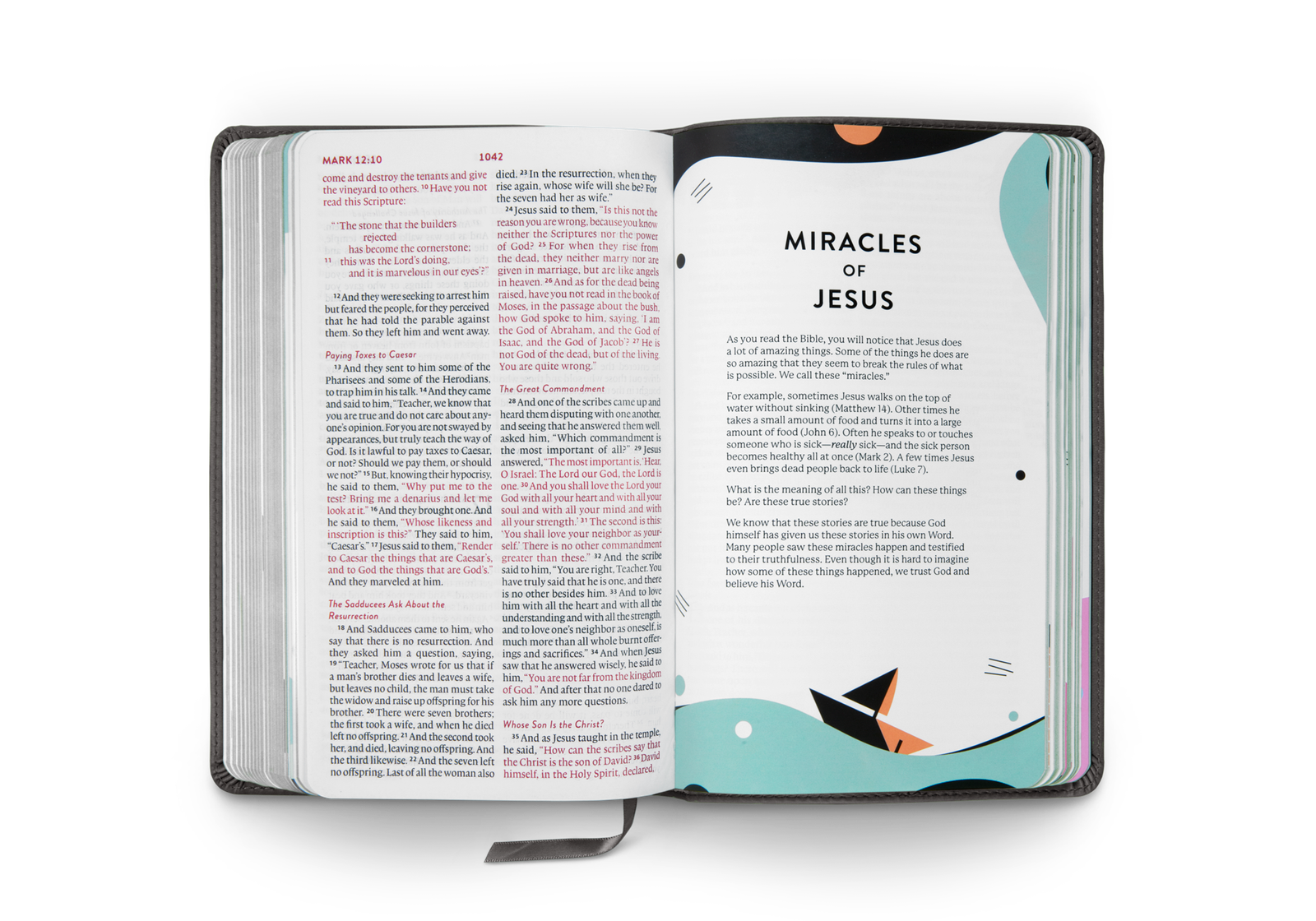 The ESV Kid’s Thinline Bible is a portable, readable, child-friendly Bible for children ages 8–12. The complete ESV text is interspersed with engaging, 4-color inserts containing helpful features that supplement a child’s Bible reading. It also includes child-friendly maps, timelines, and a dictionary for reference. Formatted in the same text setting as the ESV Large Print Thinline Bible, this Bible is easy to take to church, school, or Bible study.